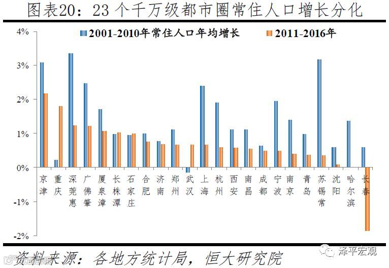 从都市圈内部看,除广佛肇、厦漳泉、京津外,多数大都市圈内的县(县级市)人口整体净流出,表明人口当前仍主要向多数大都市圈内中心区域集聚。绝大多数县及县级市为五六线城市,2011-2016年全国地级市辖区以外的县市常住人口年均增速为0.25%,远低于同期全国总体平均水平0.51%。除去县(县级市)常住人口缺失的京津、济南、长春、哈尔滨等4个大都市圈,2011-2016年19个千万级大都市圈的县(县级市)常住人口年均增速也仅为0.28%,这意味着多数大都市圈仅市辖区人口流入。