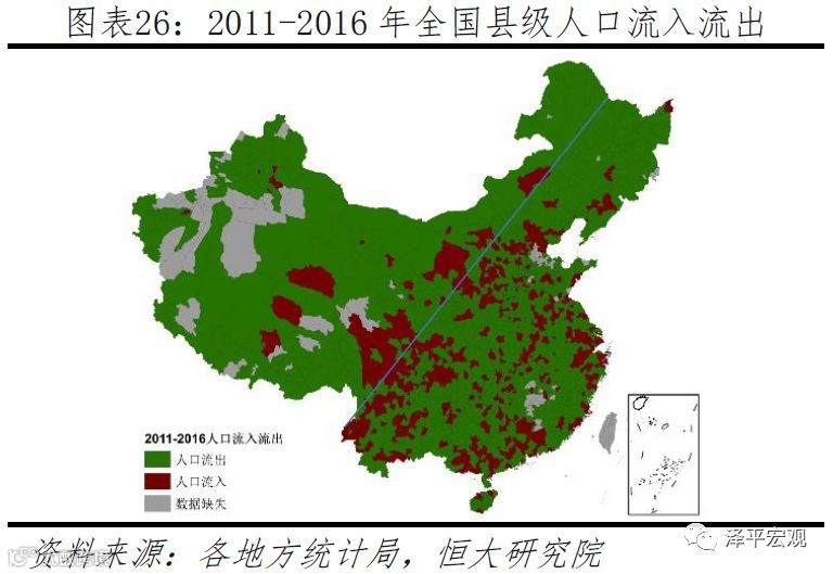 分省看,扣除直辖市和缺失数据较多的新疆、西藏、青海、江西、山东、河北以及区县级人口数据质量较差的辽宁,当前黑龙江、吉林接近全境人口流出,然后依次为陕西87.4%、甘肃86.4%、贵州85.9%,较低的三个是宁夏的38.9%、四川的45.9%、山西的50%。