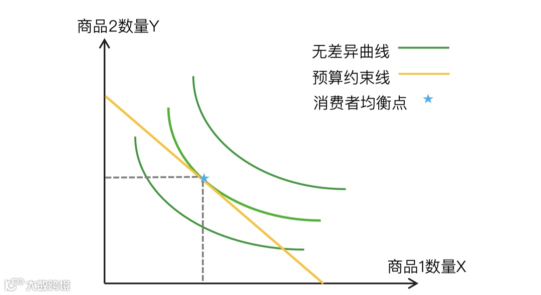 从经济学视角看,消费者也是理性经济人,在消费活动中追求个人效用最大化。消费者面临众多条无差异曲线,代表不同商品组合带来的效用相同。同时,消费者也面临预算约束,代表消费者可用于购买商品的资金。