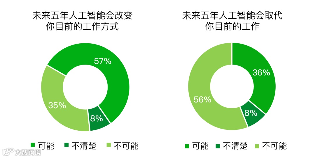 调研数据显示,有超过一半的人认为未来5年人工智能会深刻改变他们的工作方式,有36%的人认为未来五年人工智能会取代他们目前的工作。