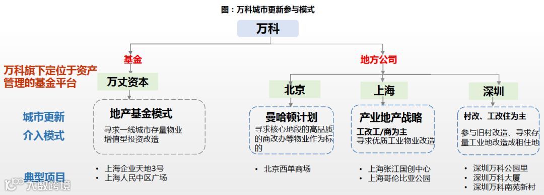 万科目前已从多种方式积极切入城市更新,总部、地方公司均积极尝试,轻重模式、基金模式综合参与: