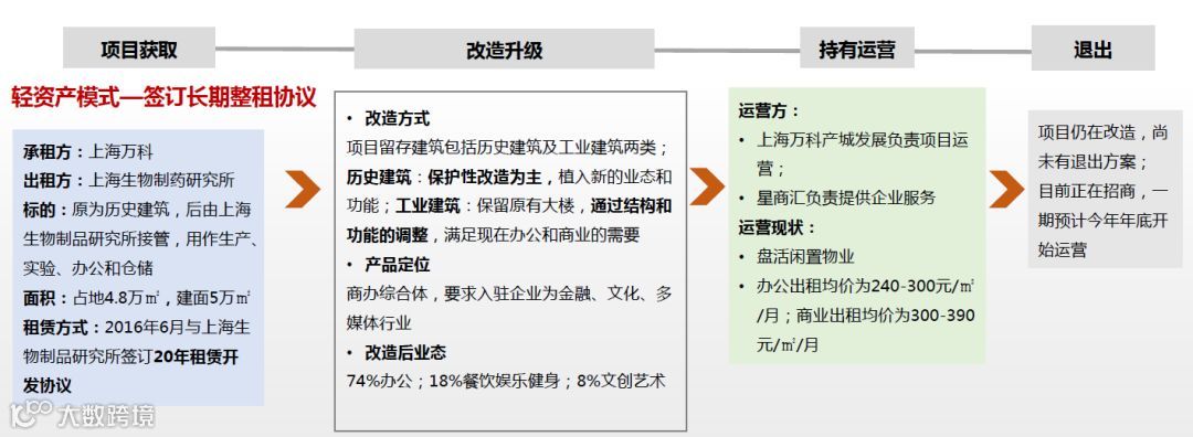 上海万科与原业主签订20年整租协议以轻资产方式获取物业,对项目更新局部改造后,重新定位为商办综合体,仍有由上海万科产城发展空星商汇负责运营管理,目前仍在招租。