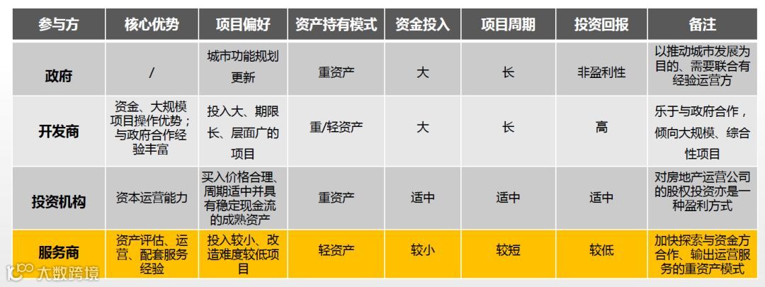 城市更新前期的参与者为政府,后期的主要参与者有投资机构(基金、金融机构等)、开发商、服务商,但他们在介入的时期、选择的资产标的、商业模式及各自优势等方面均差异显著。