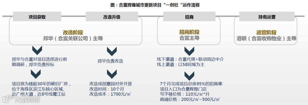 合富与关联企业邦华合作对破旧厂房改造更新为创意园—“一创社区”;合富进行前期咨询,由邦华进行项目投标、承租项目十年租期并负责工程改造,持有运营阶段则由合富进行招商和旗下物业主导运营,该项目入驻率达95%,租金溢价20%。