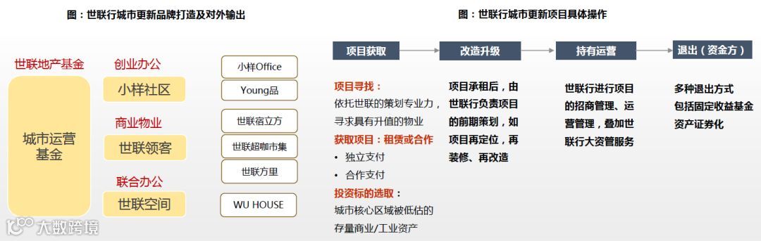 发行腾赋城市运营基金,引入启动资金租赁并改造了上海长宁、苏城两个项目;在改造升级阶段,世联行进行了具体项目的操盘,统一策划定位、装修;在运营阶段,世联行则输出旗下多样的资管服务和品牌,如小贷、小样等,最终两个项目均实现了租金溢价。