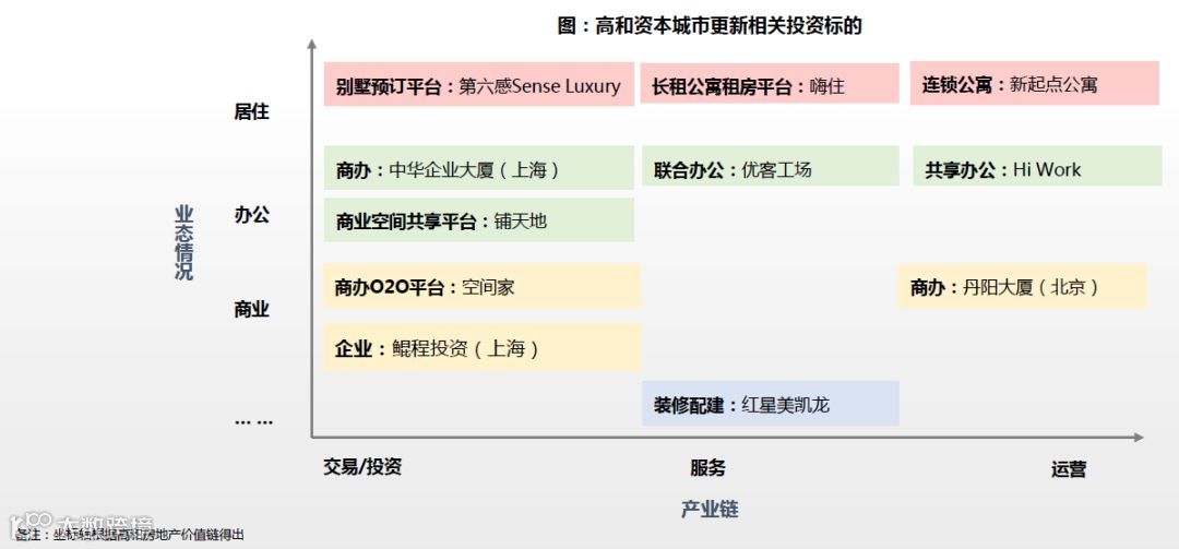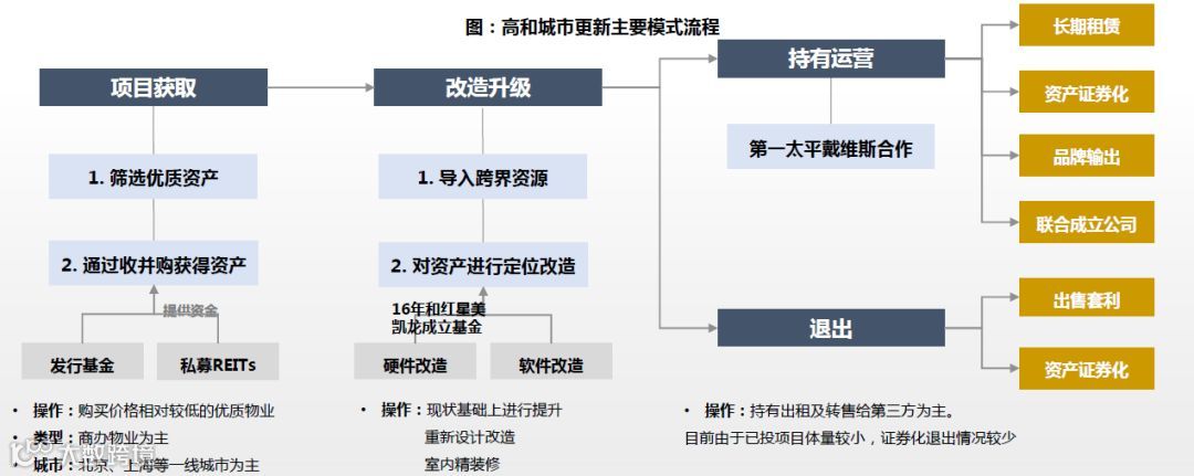高和资本的城市更新偏重一线城市商办物业更新改造,其偏好价格合理、周期适中并具有稳定现金流的成熟资产,同时也对房地产运营公司进行股权投资,连接资金、资产和跨业资源打通整体产业链条。