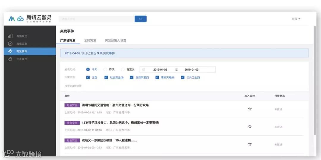 通过大数据算法挖掘,对话题、事件、热点、趋势进行声量、传播、情感、受众等多维度分析。