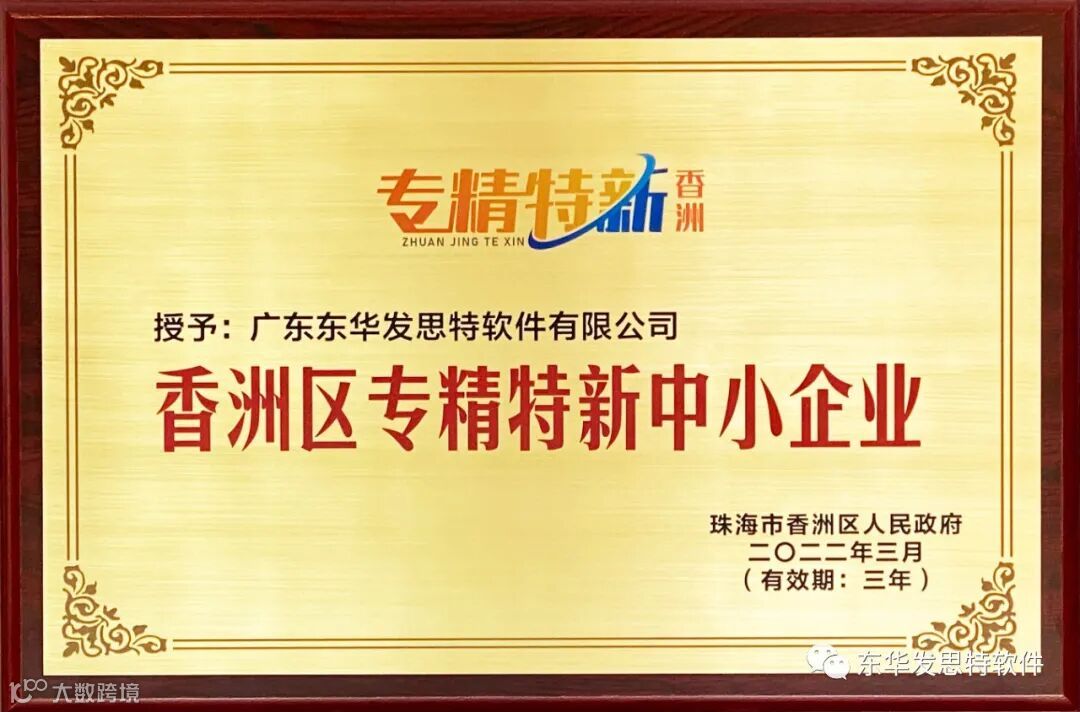 2022年3月8日由珠海市香洲区人民政府主办的“ 2022 年香洲区专精特新中小企业发展大会”隆重举行。会上对“专精特新”中小企业颁发牌匾,广东东华发思特软件有限公司从众多企业中脱颖而出,入选“珠海市香洲区专精特新中小企业”名单。