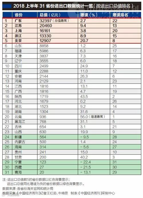 《中国经济周刊》记者汇总并梳理了2018年上半年31个省份进出口总值、进出口增速两大指标,看看这些省份在外贸方面呈现出何种态势,又有哪些特点,并且是否找到了新的发展契机。