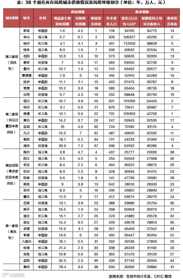 我们将以供给需求交叉分析的方法,即将现有38个潜在库存风险城市按供给、需求状况良好度排名的方式(排名规则:供给测算以库存消化周期较短的城市排名靠前,需求测算以经济实力较强,人口基数较大城市排名靠前)进行分类,同时以供给、需求的中间值即19名作为分界线,将这些典型三四线城市分类为低风险城市、供给过量型中度风险城市,需求疲软型中度风险城市、高风险城市,以此判断其中长期暗藏库存风险的等级及成因。