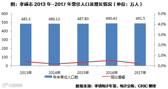 而从需求层面来看,孝感整体基本面数据并不是太好,一方面经济主要以第二产业——工业、制造业为主,不仅使得人均GDP位于省内低位;而且也不利于人民收入水平的提升,2017年城镇居民人均可支配收入仅为30264元,购买力的局限严重制约了本地房地产行业发展;另一方面孝感常住人口数相对恒定,基本维持在490万左右,自然增长率为负值,人口内生动力略有不足。