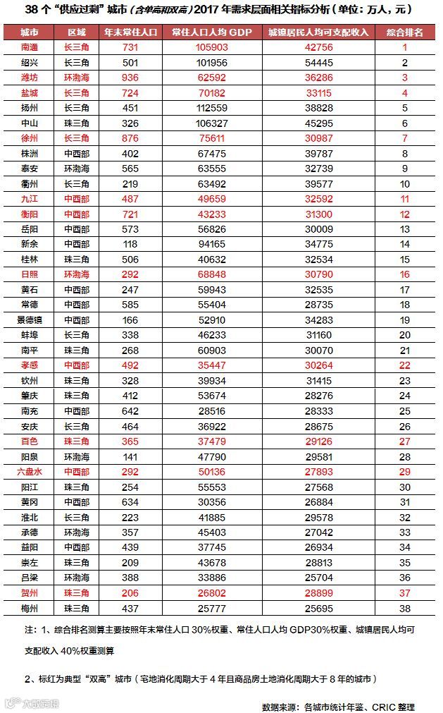 判断以上供应量相对过剩的“单高”和“双高”城市,能否在未来转化为潜在库存的一个重要依据便是需求面是否存在有效支撑。从中长期来看,人口、经济实力和购买力是制约一地房地产成交量的主要因素,因而我们选取了2017年年末常住人口,人均GDP和城镇居民人均可支配收入三个指标,对38个潜藏供应风险的城市进行了分类排名。
