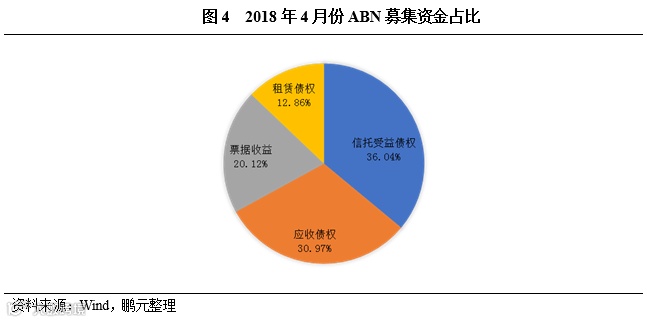 ABN募集资金中,信托受益债权类ABS占比36.04%,应收债权类ABS占比30.97%,票据收益类ABS占比20.12%,租赁债权类ABS占比12.86%。