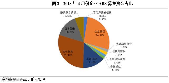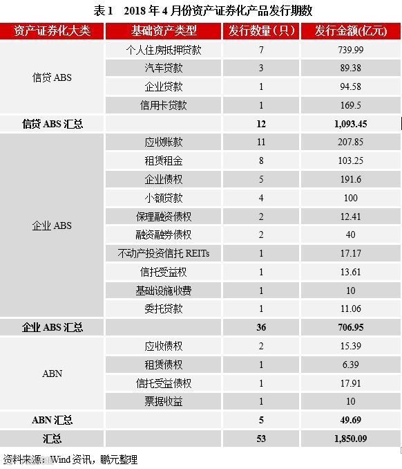据Wind资讯相关数据统计,2018年4月,我国资产证券化项目(以下简称“ABS”)共发行53期[[1]](该数据基于公开资料,可能存在遗漏),同比增加11期,其中企业ABS发行期数最多为36,信贷ABS发行期数为12,ABN发行期数为5。基础资产角度来看,企业ABS中,应收账款(11期)、租赁租金(8期)、小额贷款(4期)、信托受益权(1期)、企业债权(5期)、融资融券债权(2期)、不动产投资信托REITs(1期)、基础设施收费(1期)、保理融资债权(2期)、委托贷款(1期)。信贷ABS中,个人住房抵押贷款(7期)、汽车贷款(3期)、企业贷款(1期)、信用卡贷款(1期)。ABN中,信托受益债权(1期)、应收债权(2期)、票据收益(1期)、租赁债权(1期),详情见附件1。