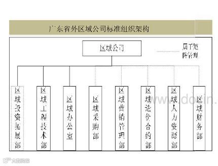 广东省内区域公司,包括5个职能部门和N个项目部。不设区域采购部和区域造价合约部,相关职能由总部负责,营销、财务部门及人员,实行区域与集团总部对应职能部门双重考核的管理体系。