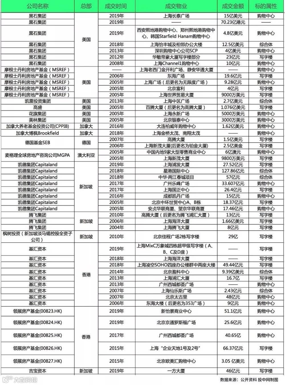 截至2019年3月27日,已有约16家外资机构参与收购内地商办楼宇。这些外资机构世界顶级投行黑石集团为首,还包括凯德、领展、腾飞、基汇资本等知名地产投资基金。
