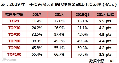 2019年一季度,虽然TOP100房企整体业绩规模略有下滑,但各梯队房企的销售金额集中度较去年保持了一定幅度的提升。其中,TOP30房企集中度近50%,TOP100房企集中度达70.5%。