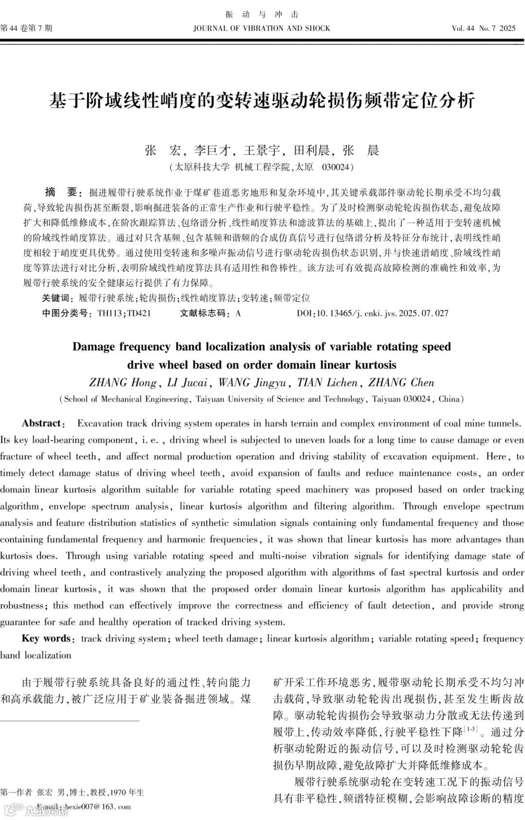 论文赏析‖基于阶域线性峭度的变转速驱动轮损伤频带定位分析