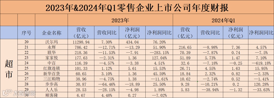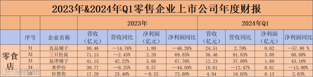 从财报数据来看,上市的零售企业中,一半以上的企业2023&2024年Q1都出现了业绩下滑,只有少数几家实现业绩增长。