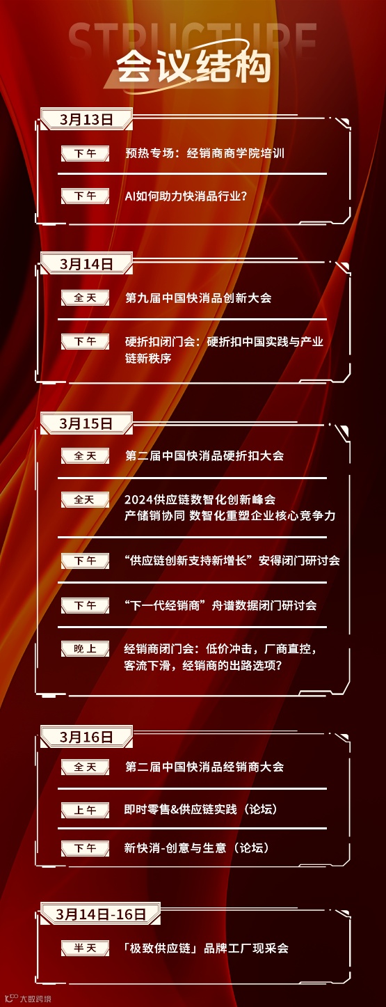 本届大会将围绕「供应链革命」为主题,3天时间,一场主论坛,一场中国快消品硬折扣大会,一场中国快消品经销商大会,十余场分论坛及闭门交流会,更有第一次重磅亮相的【极致供应链】品牌工厂现采会,将与来自全国的数千名快消品品牌商、经销商以及零售变革者、产业服务者一起相约成都,持续烧脑,共同探讨供应链革命时代的挑战与机遇,变革与出路。