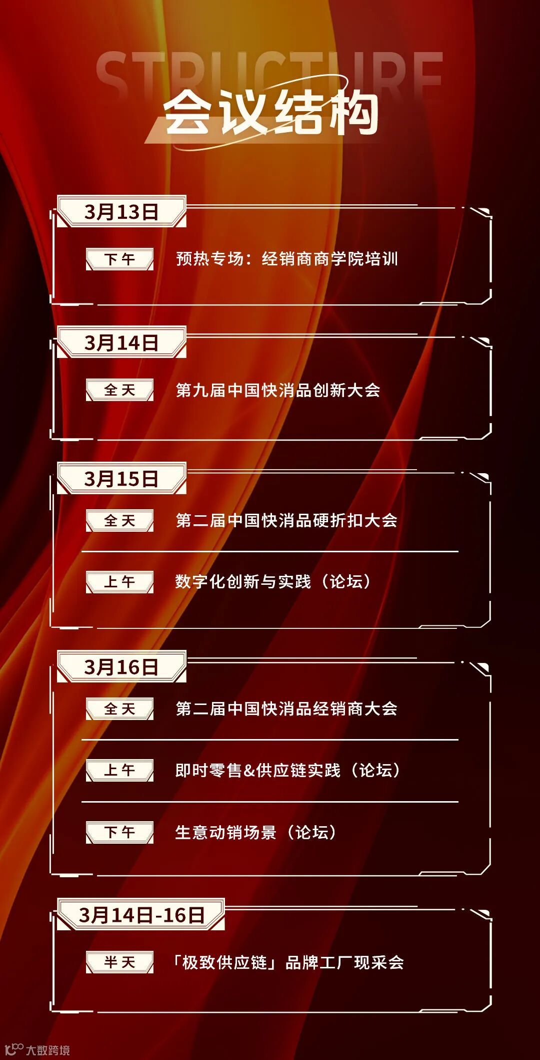 本届大会将围绕「供应链革命」为主题,3天时间,一场主论坛,一场中国快消品硬折扣大会,一场中国快消品经销商大会,十余场分论坛及闭门交流会,更有第一次重磅亮相的【极致供应链】品牌工厂现采会,将与来自全国的数千名快消品品牌商、经销商以及零售变革者、产业服务者一起相约成都,持续烧脑,共同探讨供应链革命时代的挑战与机遇,变革与出路。
