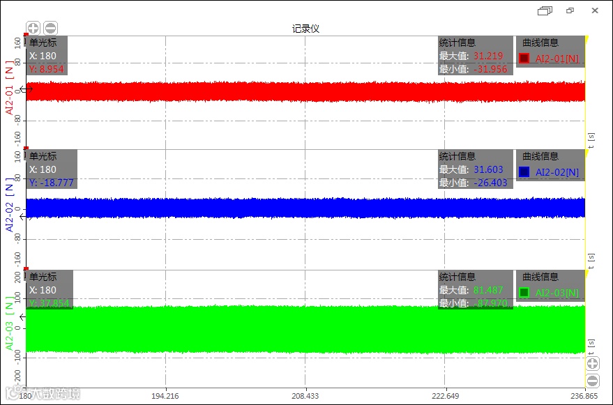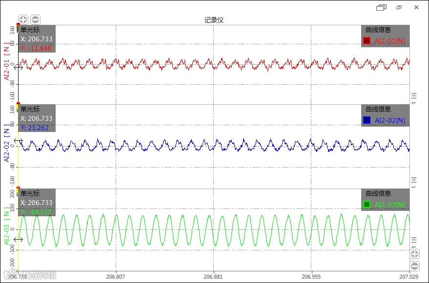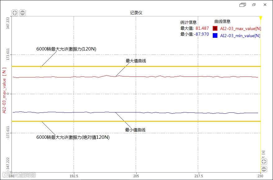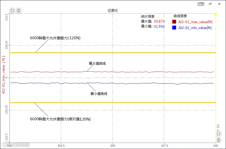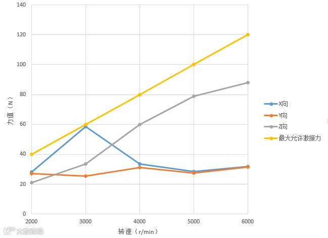 | 序号 | 转速r/min | 最大允许激振力(N)(Fmax=0.02×转速) | X轴向力值 N | Y轴向力值 N | Z轴向力值 N |