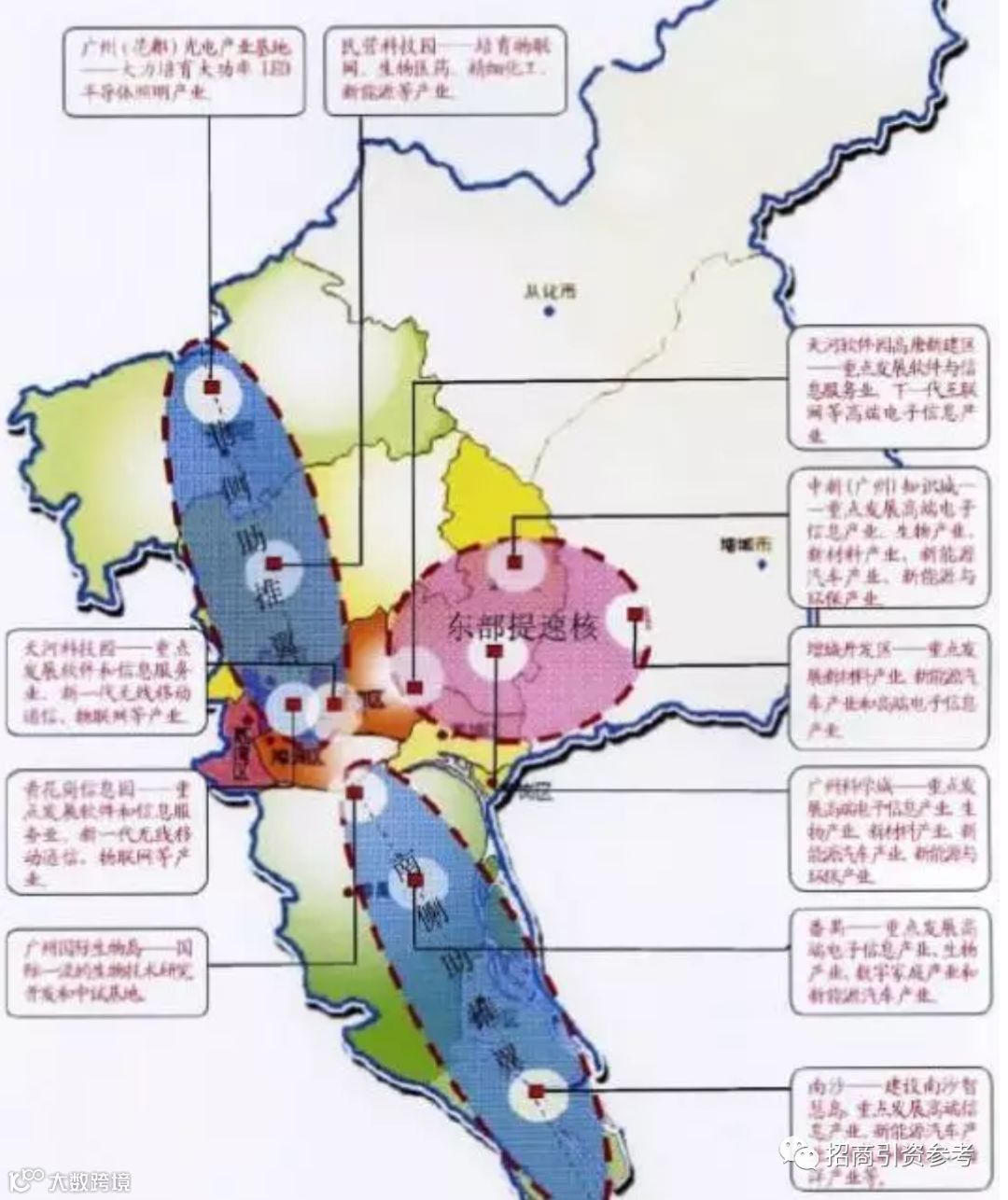 珠江景观带多点支撑——珠江新城、广州国际金融城、琶洲互联网创新集聚区;天河智慧州南站商务区、广州北站商务区、广州国际创新城、白鹅潭经济圈、白云新城、北京路城化核心区、新中轴线南段商务区、黄墙临港经济区、从化经济开发区。
