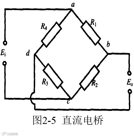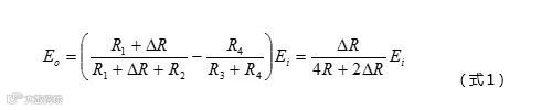 如下为惠斯通电桥,Eo为输出端电压,Ei为供桥电压,输出端电压随着桥臂电阻的变化而变化,如式(1)所示,由于ΔR<<R,可以忽略分母中的ΔR项和分子中ΔR的高次项,对于最常用的全等臂电桥,可简化为式(2)。
