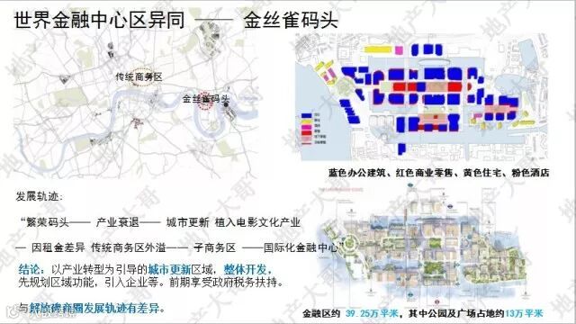 繁荣码头—产业衰退—城市更新,植入电影文化产业—因租金差异,传统商务区外溢—子商务区—国际化金融中心。