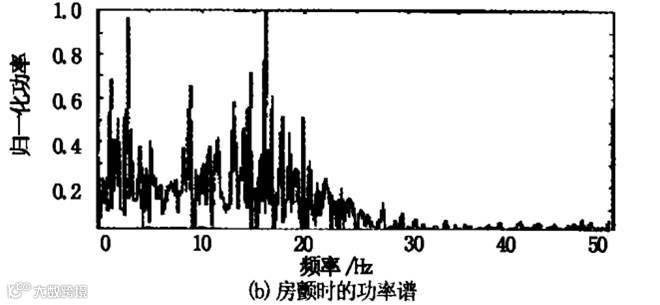 医学上也常常通过频谱分析,来诊断疾病。下面举几个频域分析在医学中应用的例子。心电信号的功率频谱图可以明显看出:未房颤时功率谱的谱线分布均匀,波谷都能回到零线;而房颤时,谱线疏密不等,有些谱线的波谷不能回零线。