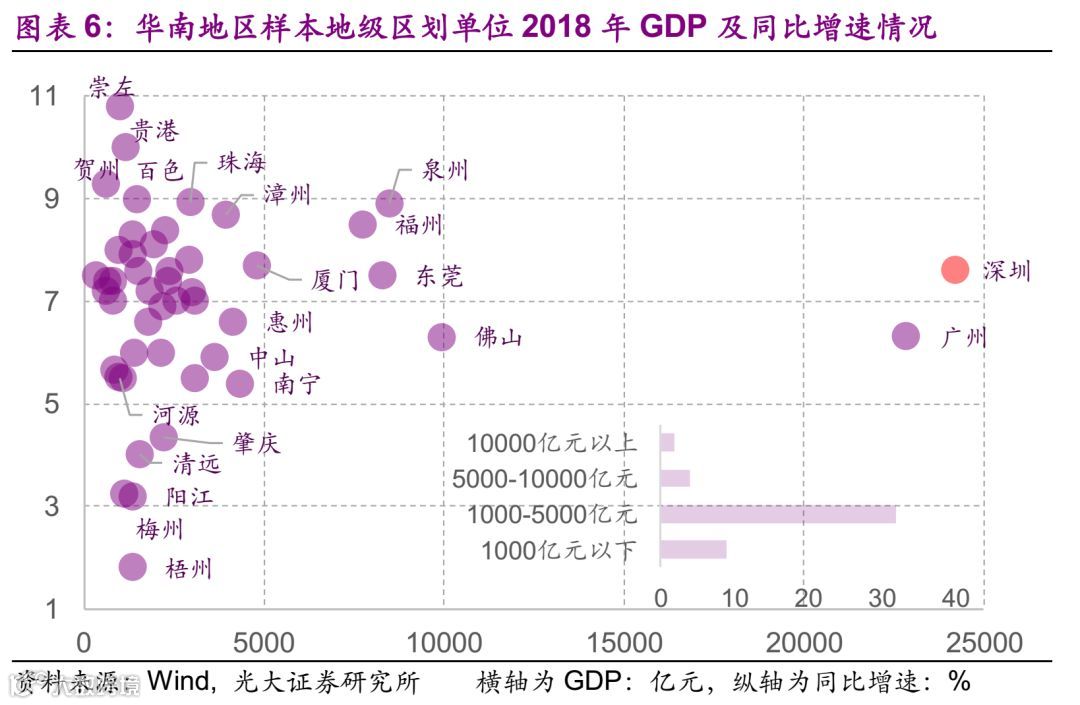 华南地区48个样本中,2018年GDP体量最大的为深圳,规模达2.42万亿,中位数为2047亿元。华南地区GDP规模万亿以上地级市共2个,GDP规模多处于1000-5000亿元,占比69%。