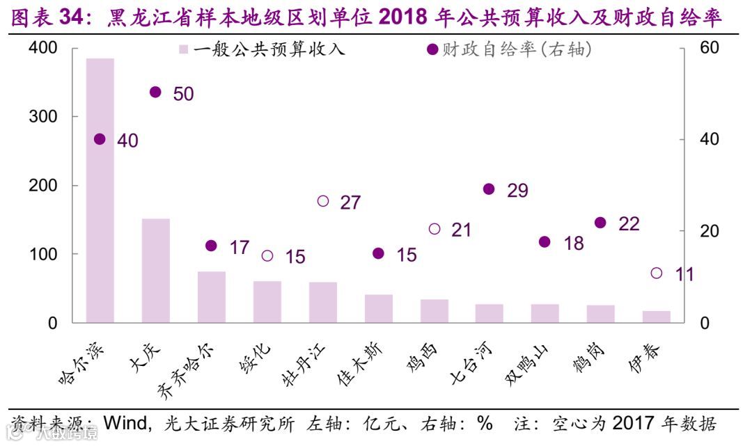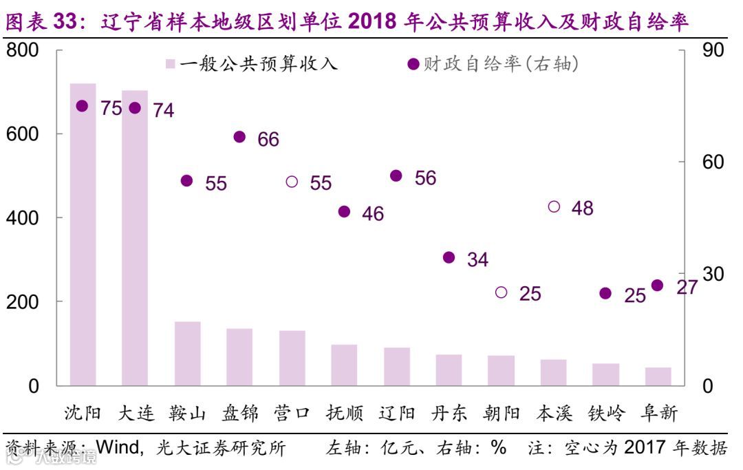 财政方面的情况,2018年一般公共预算收入最大的为沈阳,为721亿元,东北地区29个样本中一般公共预算收入的中位数为61亿元。