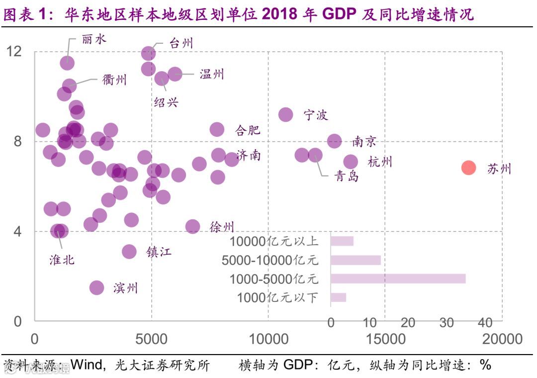 华东地区58个样本中,2018年GDP体量最大的为苏州,规模达1.86万亿,中位数为3491亿元。华东地区GDP规模万亿以上地级市共6个,GDP规模多处于1000-5000亿元,占比60%。