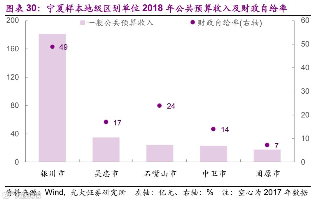 财政方面的情况,2018年一般公共预算收入最大的为西安,为684.71亿元,西北地区39个样本中一般公共预算收入的中位数为31亿元。