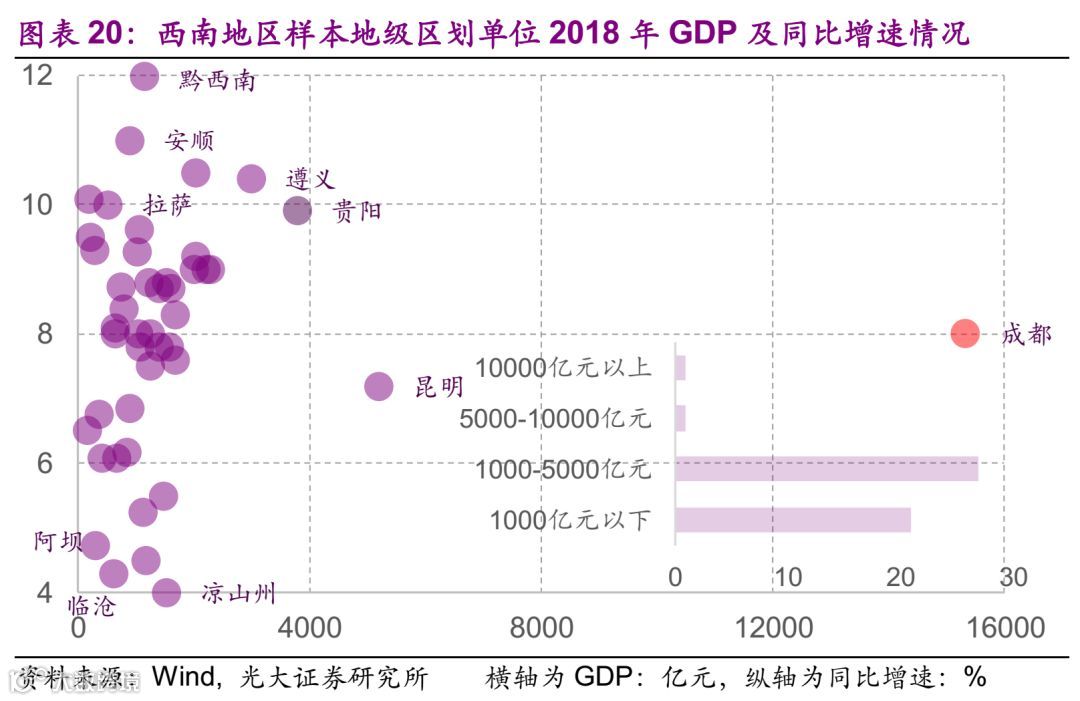 西南地区50个样本中,2018年GDP体量最大的为成都,规模达1.53万亿,中位数为1094亿元。西南地区GDP规模万亿以上地级市共1个,GDP规模多处于1000-5000亿元,占比59%。
