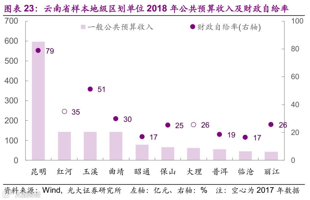 财政方面的情况,2018年一般公共预算收入最大的为成都,为1529亿元,西南地区50个样本中一般公共预算收入的中位数为74亿元。