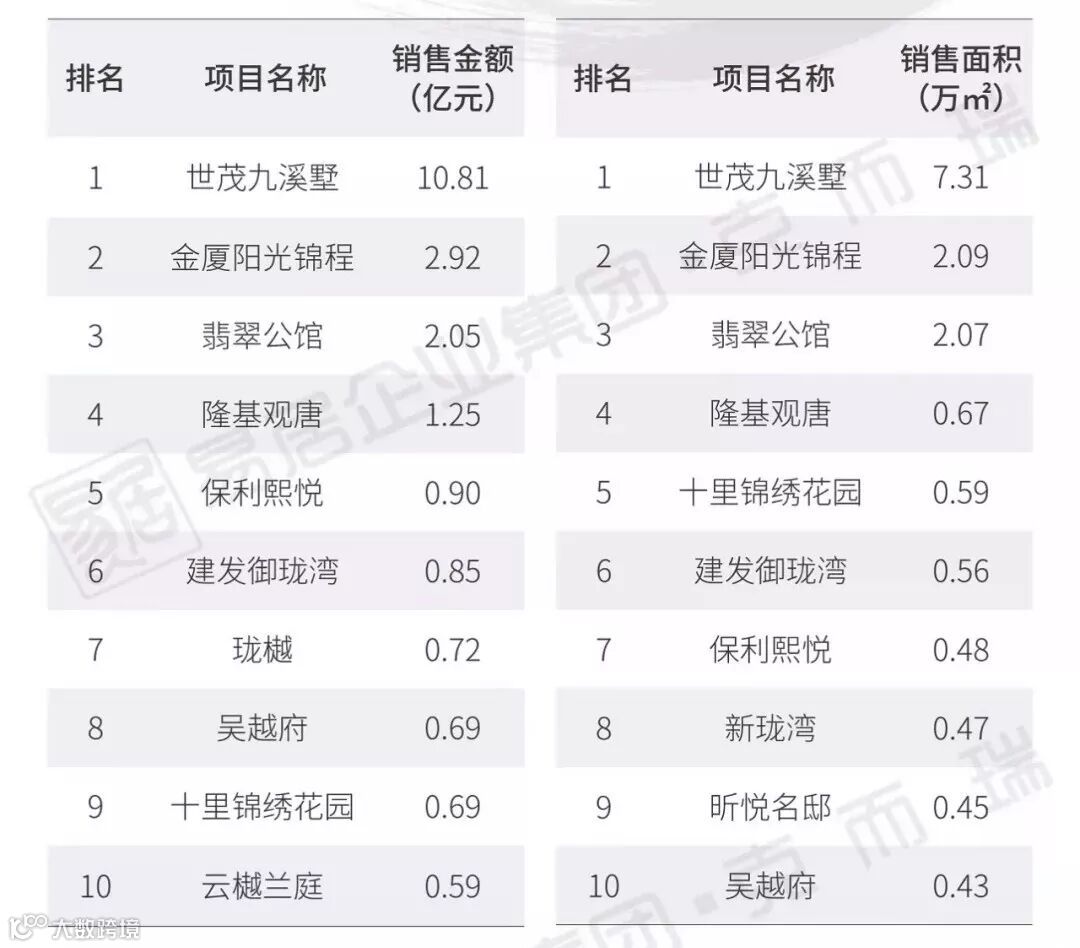 世茂九溪墅以10.81亿、7.31万方销售成绩,跃升金额榜、面积榜冠军。另外,翡翠公馆、隆基观唐等盘也位居榜单前列。