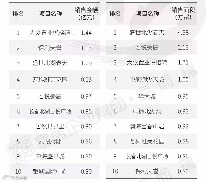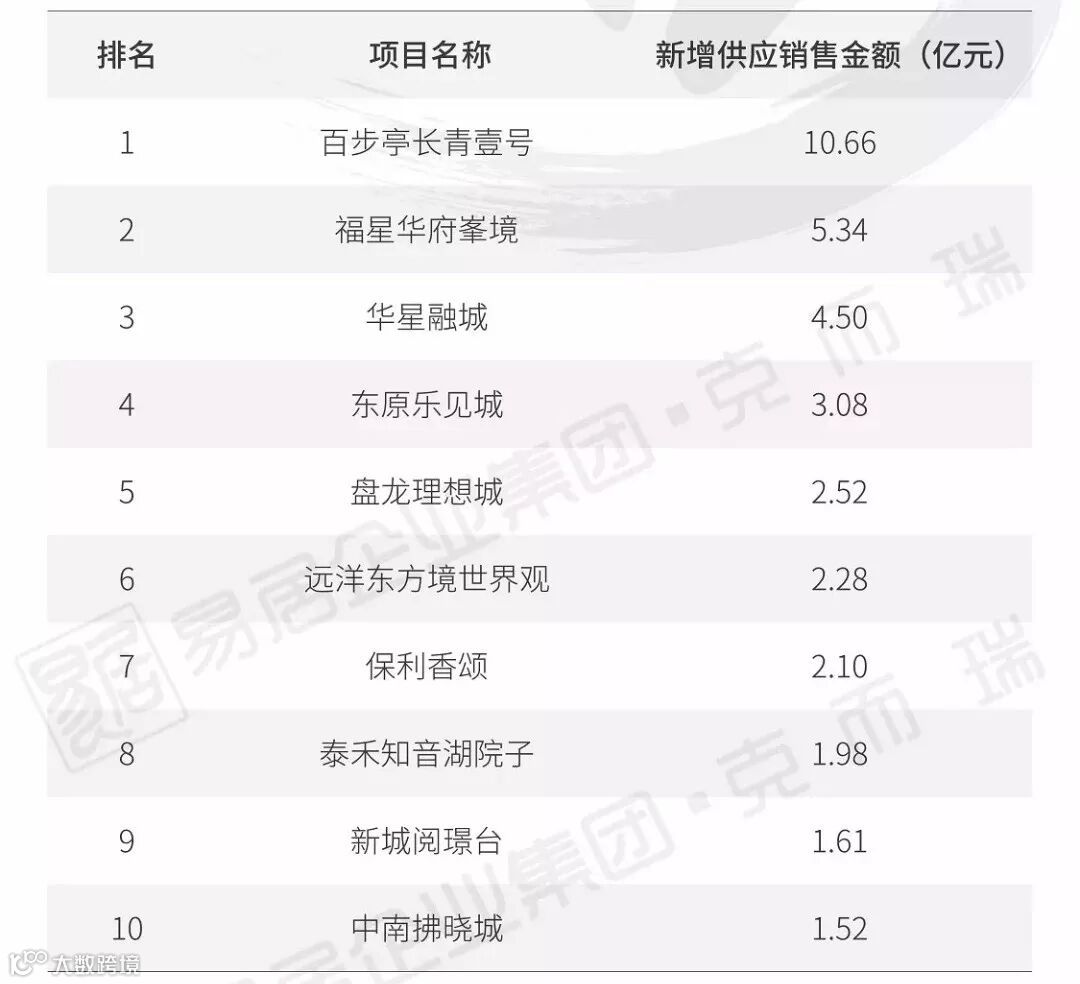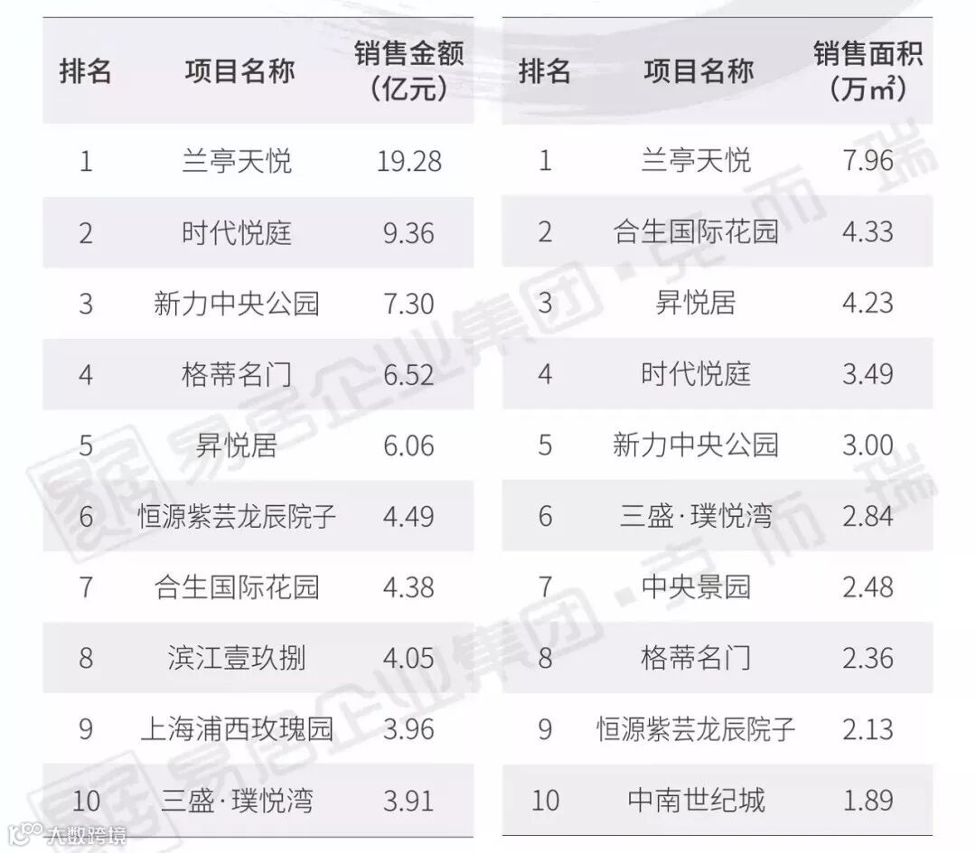 兰亭天悦以19.28亿、7.96万方的销售成绩荣登榜首。另外,时代悦庭、合生国际花园等盘也跻身榜单前列。