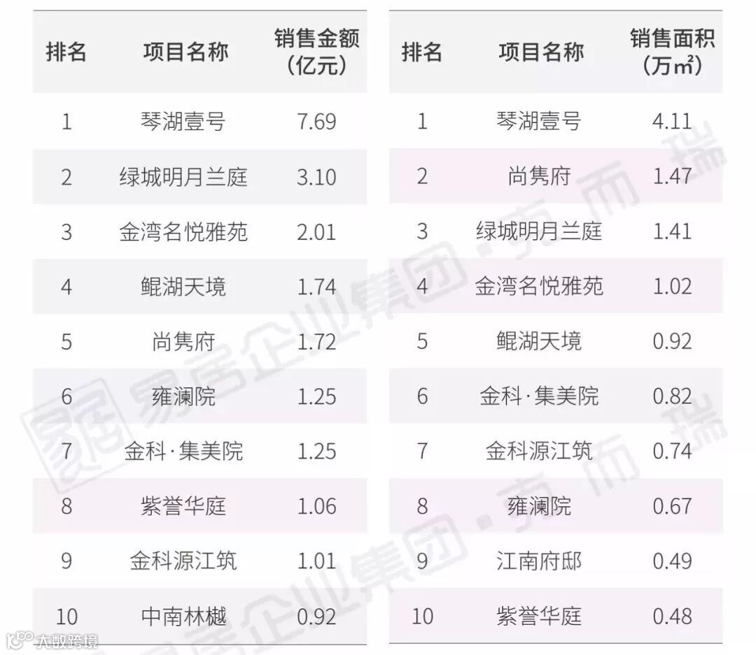 琴湖壹号以7.69亿、4.11万方的成交表现领跑全市。另外,绿城明月兰庭、尚隽府等盘也取得较好的销量,均跻身榜单之中。