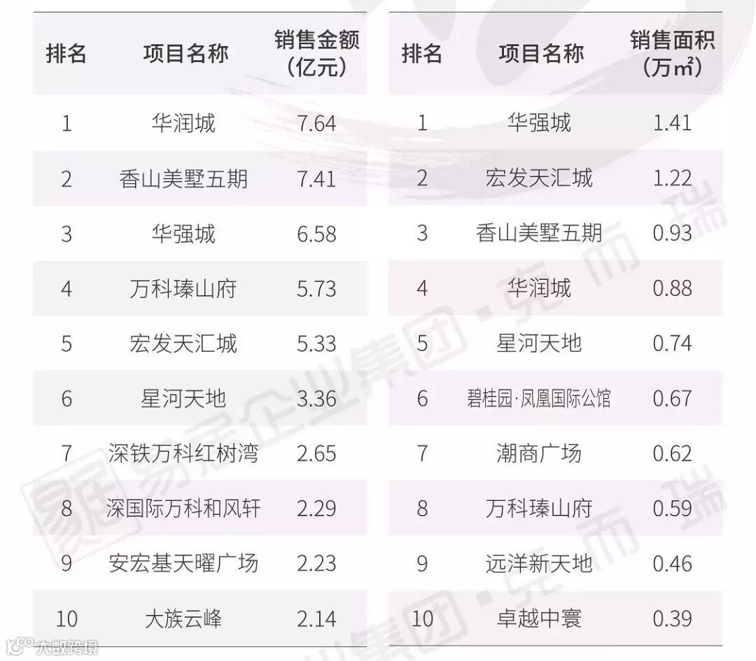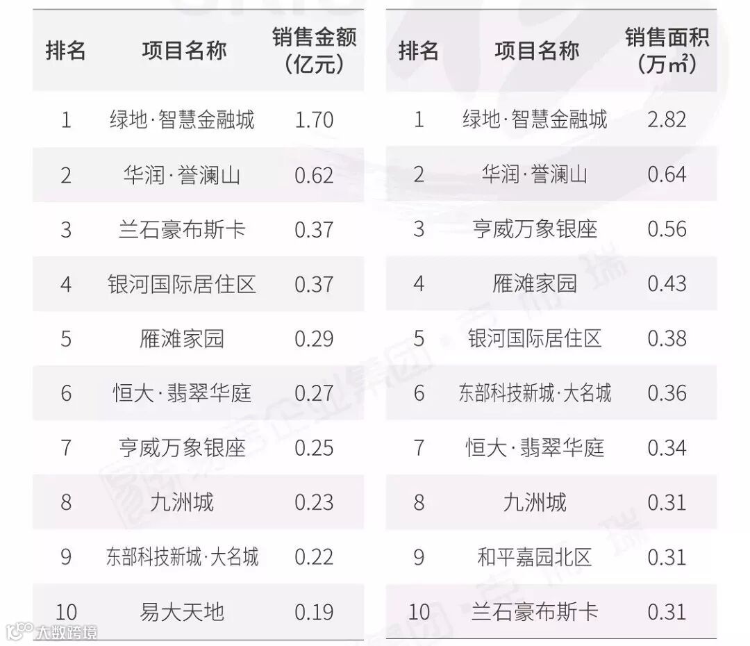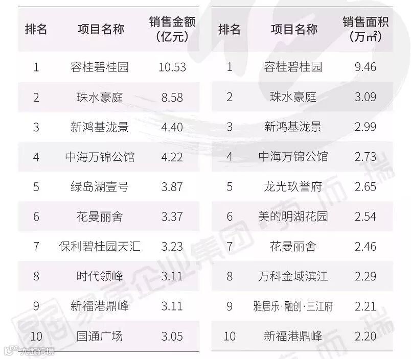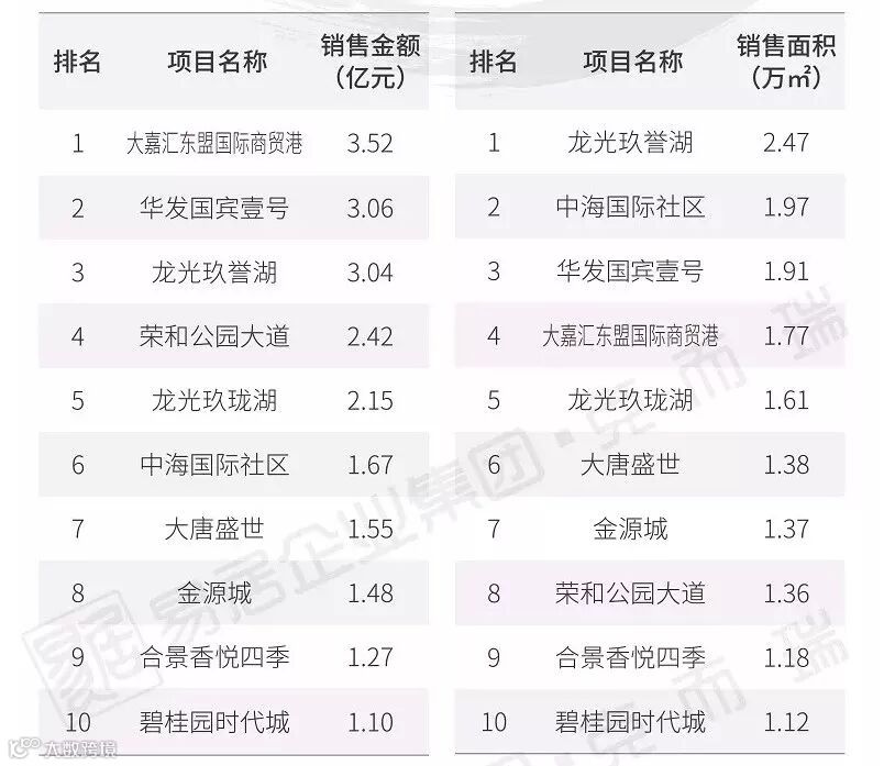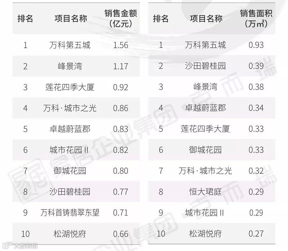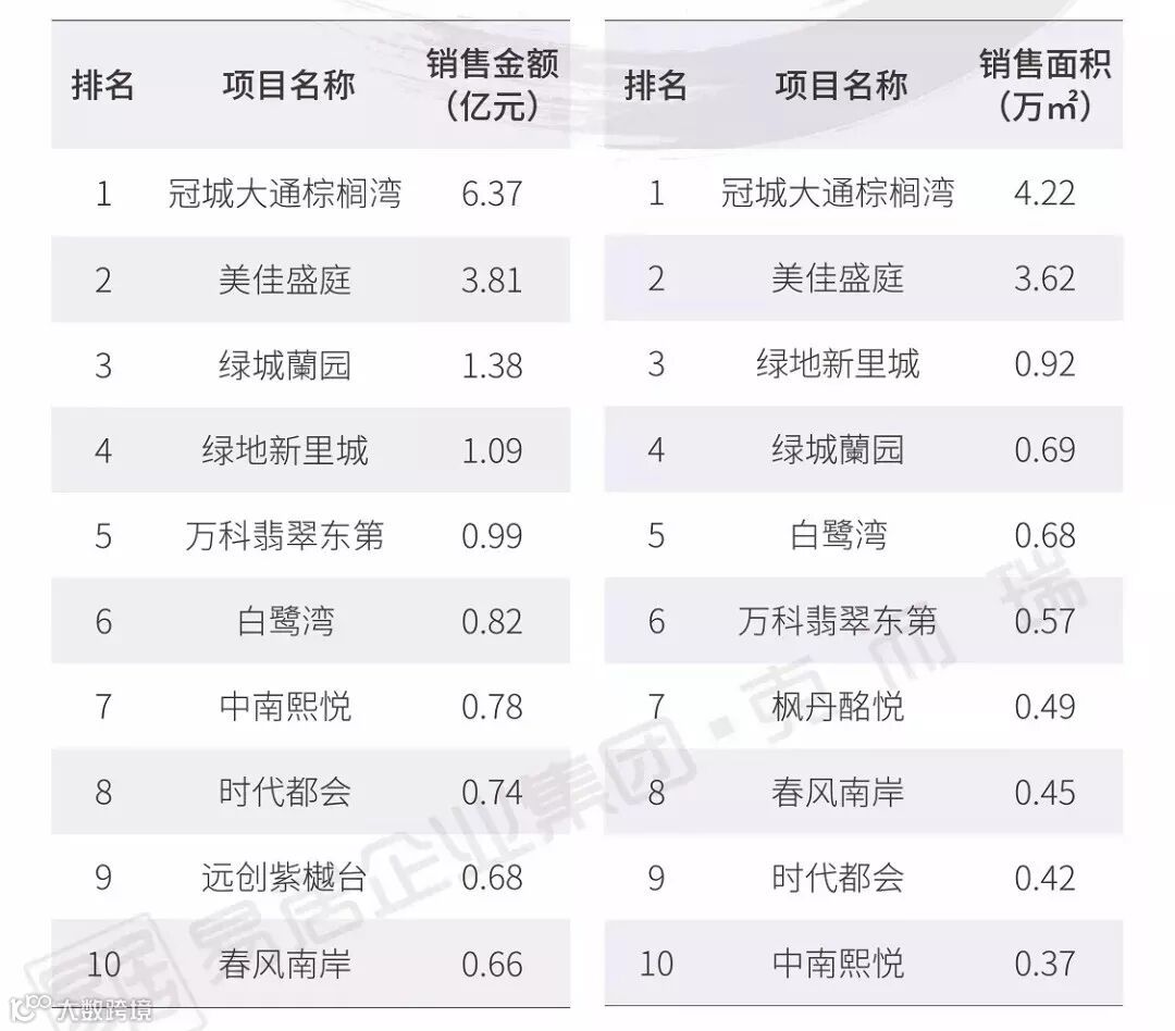 从单个项目销售情况来看,保亿·公元印、金辉世界城、康桥悦蓉园不论在销售金额或是在销售面积中都名列前三。