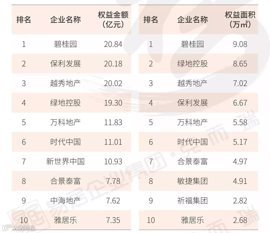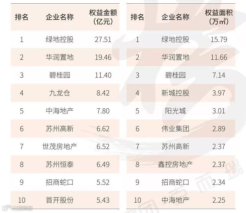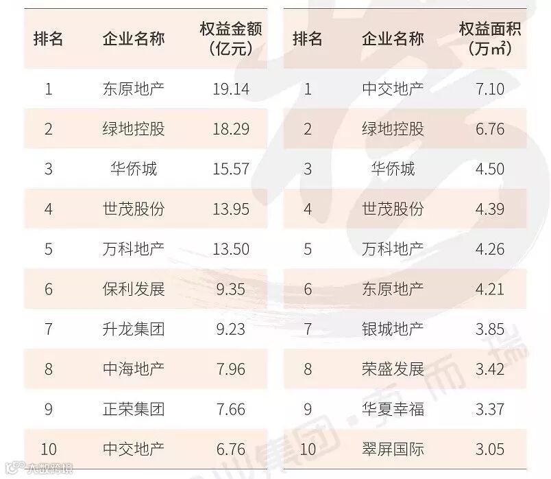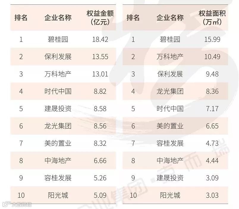 在权益金额排行榜中,绿地控股、华润置地以及碧桂园跻身权益销售榜前三。