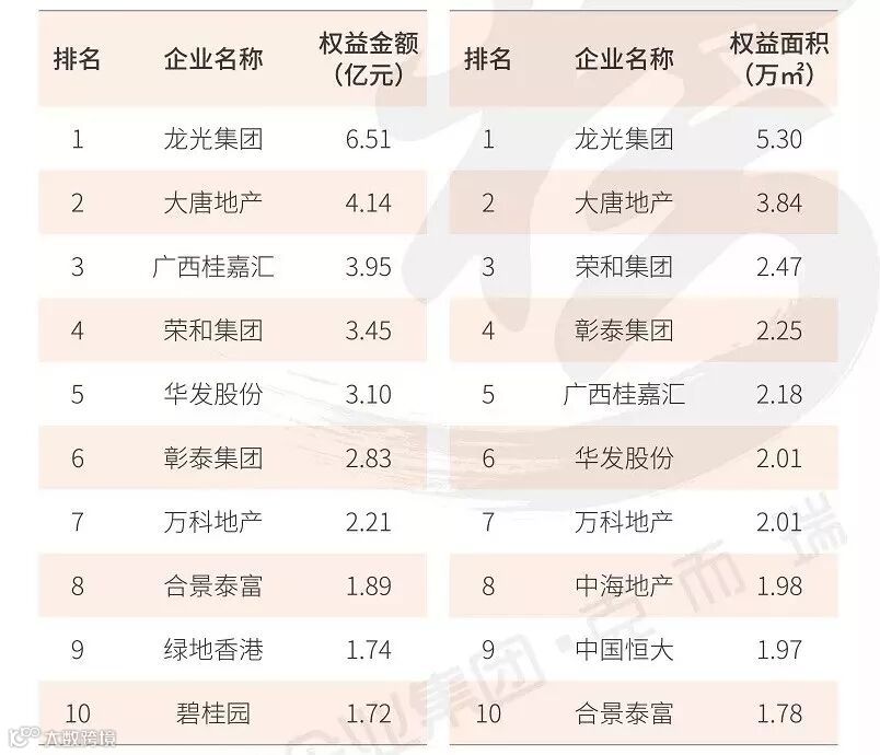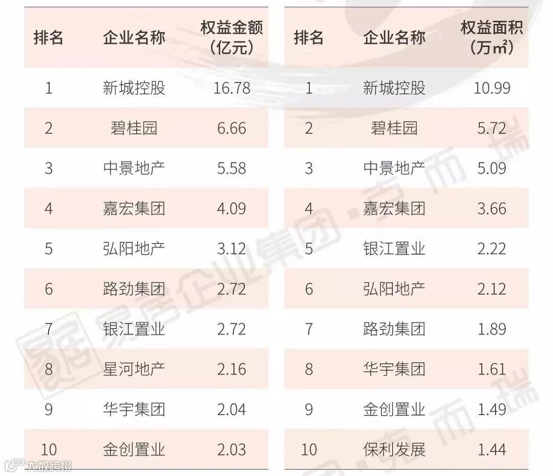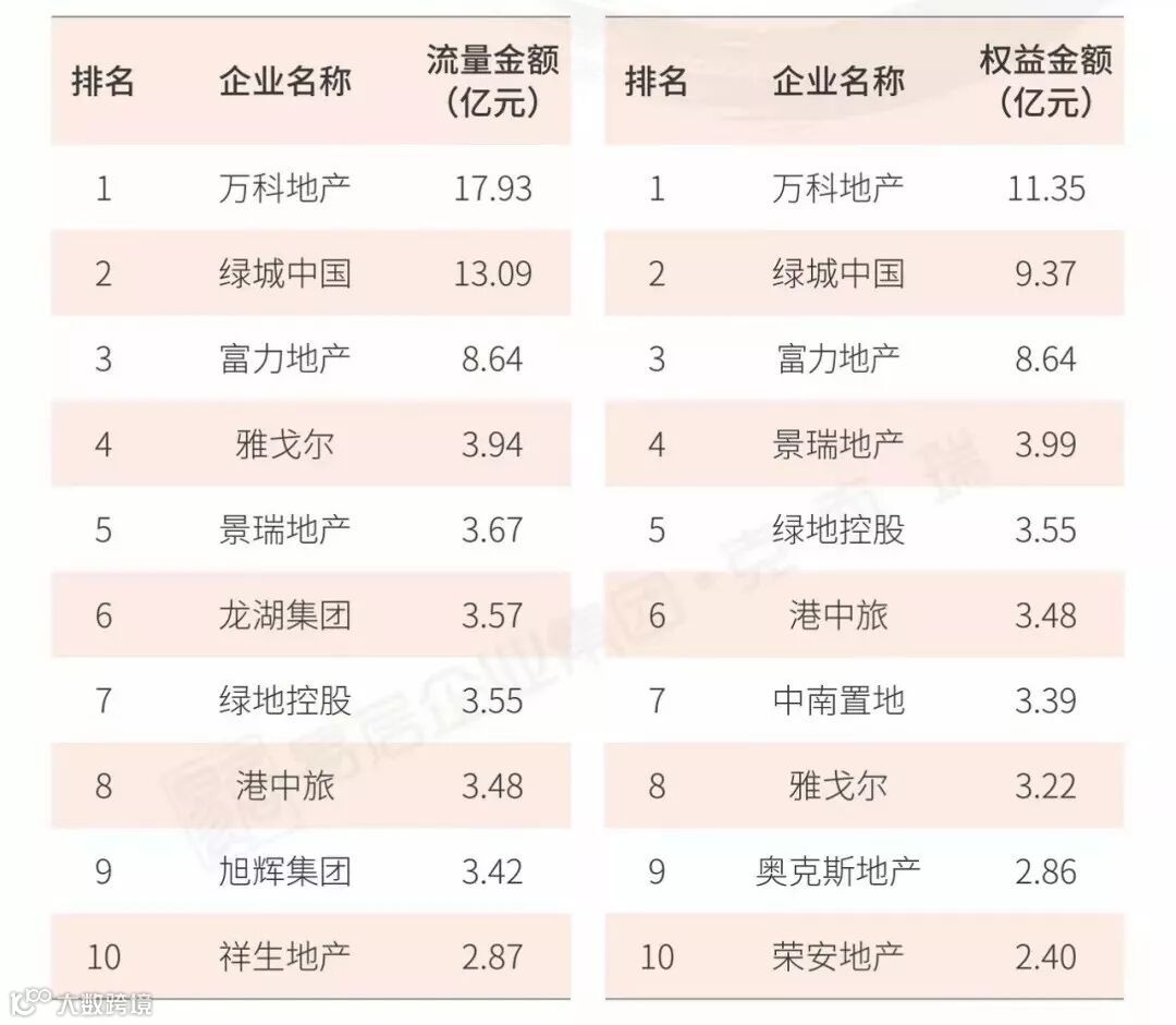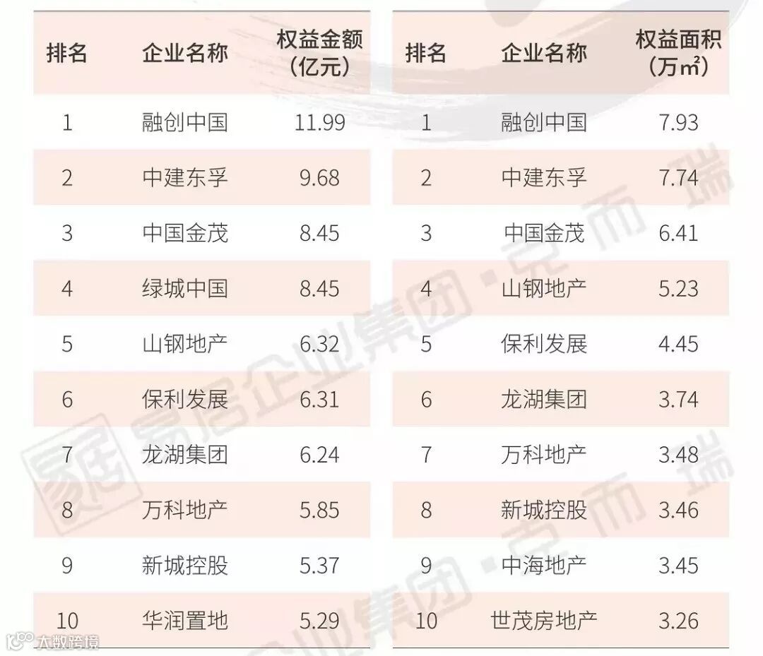 在权益金额排行榜中,绿地控股、华润置地以及碧桂园跻身权益销售榜前三。