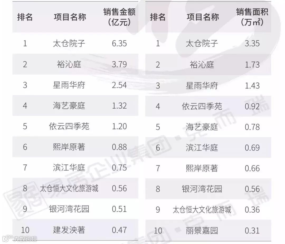 太仓院子以6.35亿、3.35万㎡成交表现独占鳌头,领先优势明显。另外,裕沁庭、星雨华府等盘也成交表现出色,跻身榜单前列。