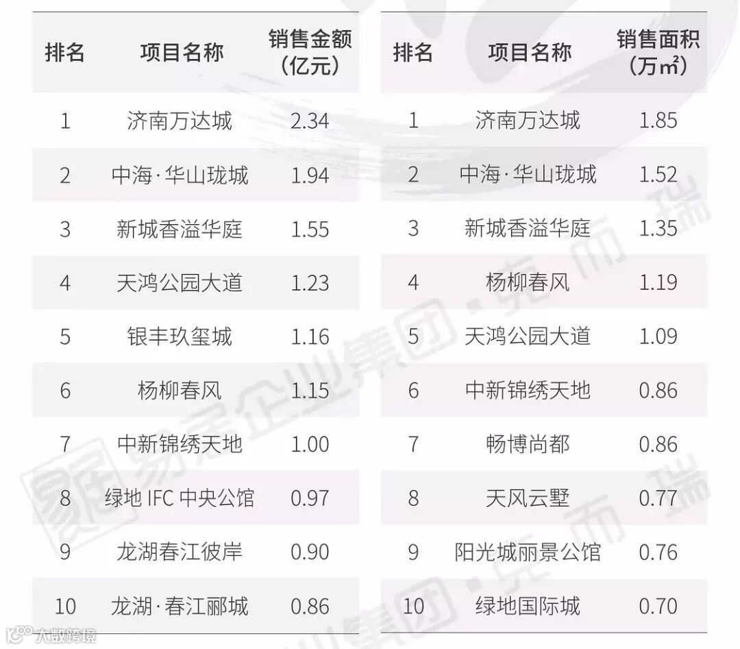 从业绩来看,融创、万科、绿地夺得济南2019年1-2月房企金额榜与面积榜双榜单前三甲。济南万达城、中海·华山珑城与新城香溢华庭夺得济南2019年2月项目金额榜与面积榜双榜单前三甲。