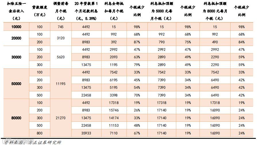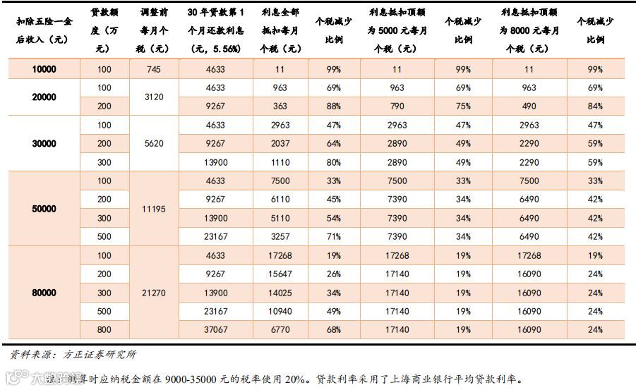 2)我们认为此次改革对于房贷利息的抵扣有较大概率是存在抵扣上限的,且不同地区的上限可能不同。房贷利息抵扣的限额越高,实际减税幅度约大。假设限额为5000元,月收入80000元的和30000元的减税比例仅有19%和49%。而若限额为8000元,那么减税比例将提升到24%和59%。我们认为一线城市的限额肯定会高于其他城市,从而真正起到按照实际负担能力来调节收入分配的作用。