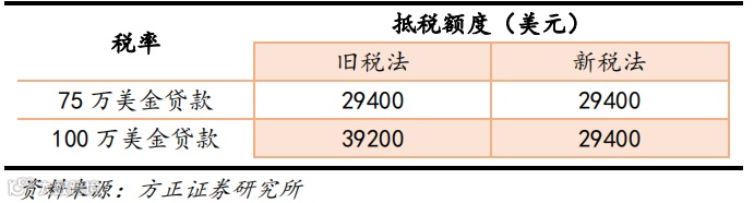 美国的房贷利息抵税政策举例为:如果纳税人年收入为50000美元,年内要付5000美元的房贷利息,那么他的税基是45000美元。特朗普税改后,按揭利息抵扣限额上限调整至75万美元,旧税法中按揭利息抵扣限额上限为100万美元。假设一位纳税人新购置了一栋房屋,按揭贷款150万美元。按照最新税改法案要求,该纳税人在报税时最多可以抵扣为其中75万美元的贷款所付的利息。而依照现行法律,该纳税人最多可以抵扣为100万美元的贷款所付的利息。