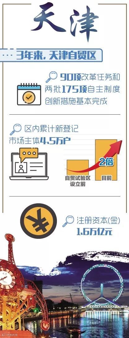 据悉,天津自贸区获批3年来,改革开放红利持续释放。截至目前,90项改革任务和两批175项自主制度创新措施基本完成,区内累计新登记市场主体4.5万户,是自贸区设立前历年登记市场主体户数的2倍,注册资本(金)1.6万亿元。使用天津市1%的面积创造了天津市约12%的地区生产总值、近10%的一般预算收入、四分之一的实际利用外资,以及三分之一的外贸进出口额。