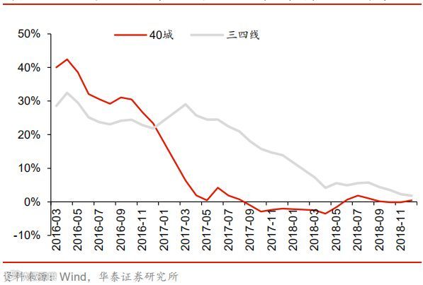 图:40城与三四线城市(全国-40城)商品房销售面积累计同比