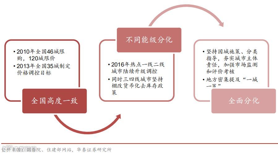 过去地产政策周期存在较大的一致性,而这轮各地政策严控和宽松并存。如在2010年4月新国十条出台之后,全国超过46个城市出台限购,超过120个城市出台限价令,导致2011年整体市场快速冷却,如2013年2月新国五条出台,要求全国35个大城市制定价格调控目标。而这轮周期强调的是因城施策、一城一策,使得城市和城市之间政策框架差异较大,严格的限购限贷政策和宽松的去库存政策同时存在,使得过去城市之间高度的一致性淡化,不同能级、不同区域城市之间全面分化,分化维度的下沉伴随调控精确度的同步提升。