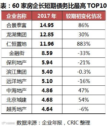 2017年170家房企现金短债比的加权平均值为1.28,较2016年末的1.71下降了25%,但现金基本可以覆盖短期负债,整体来看短期偿债压力不大。其中104家房企的现金短债比均有不同程度的下降,这主要是因为短期负债增幅较大,短期负债由2016年末11954亿元跃升至18702亿元,增幅达到了56%。分析原因,主要是2015年的公司债浪潮下,房企纷纷通过发行公司债补充流动资金,其中3年内的长债转化为短债,部分房企已然面临还债高峰期;此外还有部分正处于快速扩张的房企如阳光城、金科等,积极尝试(超)短期融资券、1年期优先票据、短期银行借款、信托贷款等其他方式补充资金,因而提升了其短期债务比例。
